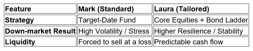 His friend Laura took a different path. She worked with an advisor to build a customized portfolio that reflected her specific situation. A core of diversified equities for long-term growth, a laddered bond strategy to generate steady income and reduce interest-rate risk, and a modest allocation to alternatives for added diversification beyond stocks and bonds. In her taxable accounts, she included municipal bonds to help minimize current taxes. When the same market downturn hit, her portfolio held up better due to the balanced structure. She had predictable cash flow to meet near-term needs without selling equities at a loss, and she felt more in control throughout the volatility. Over time, the tailored approach gave her greater peace of mind and flexibility to adjust as her circumstances evolved.